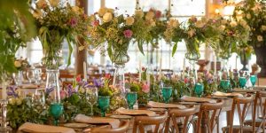 Blending natural elements with refined details to create a vibrant and inviting atmosphere. The wooden table serves as a rustic foundation, upon which abundant and colorful floral decor centerpieces create a striking focal point. Vintage-inspired glassware adds a touch of charm and elegance, complemented by the soft glow of candles that enhance the ambiance. A simple, neutral-colored, and subtle backdrop ensures the setting doesn’t feel too cluttered and allows the other elements to shine.