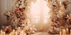 Emphasizes soft, romantic colors, and abundant floral arrangements to create an atmosphere of dreamy elegance, often used in weddings. Light pinks, whites, and creams in the floral arrangements contributes to the soft romantic feel. A flower-covered archway covered creates a stunning focal point, while candles cast a warm and inviting glow. The overall effect is luxurious and intimate.